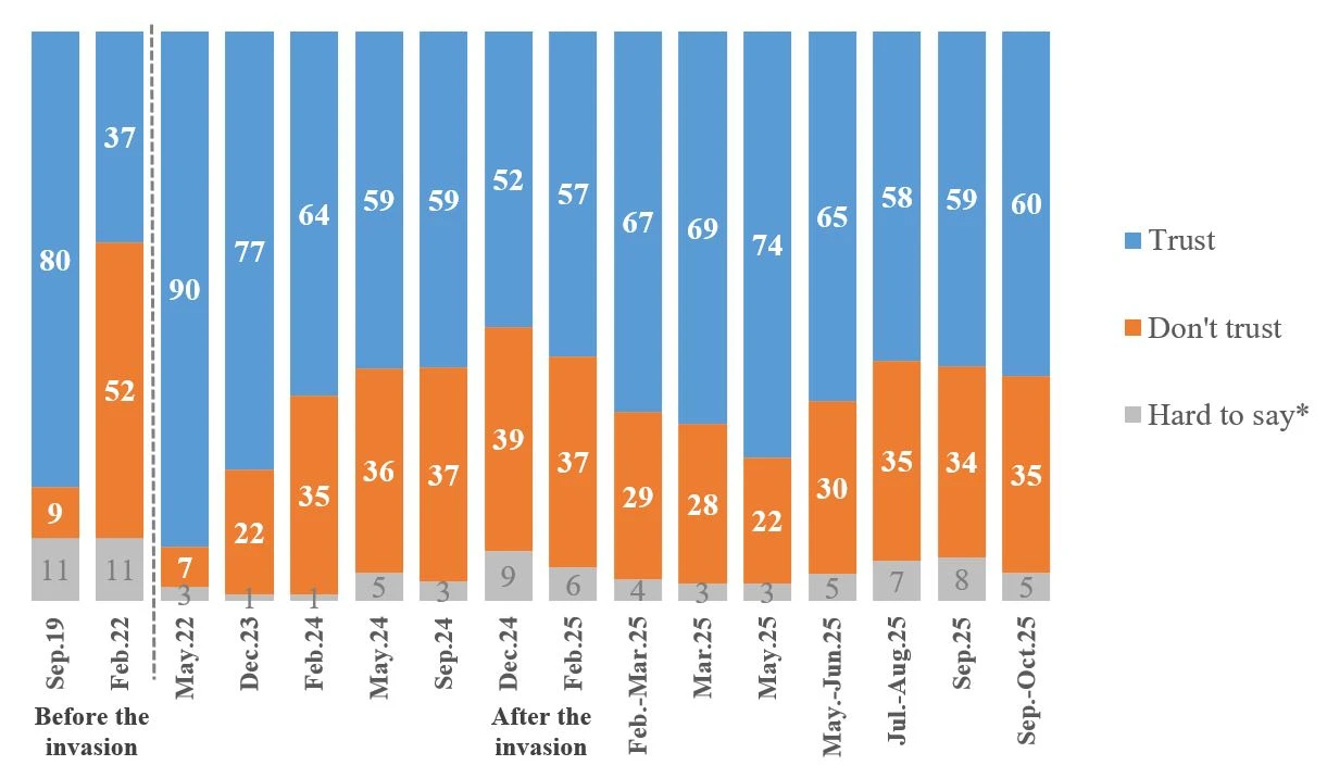 Although the current level of trust is lower than in May, when it reached its highest level in recent times, it remains higher than in December 2024, when it hit its lowest point since the start of Russia's full-scale invasion in February 2022.