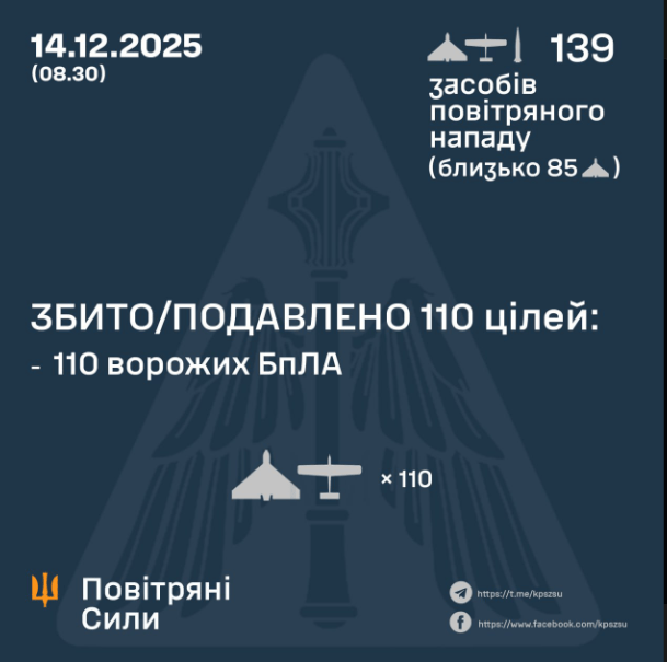 According to preliminary data, as of 08:30, air defenses shot down/suppressed 110 enemy Shahed, Gerber UAVs and drones of other types in the north, south, and east of the country.