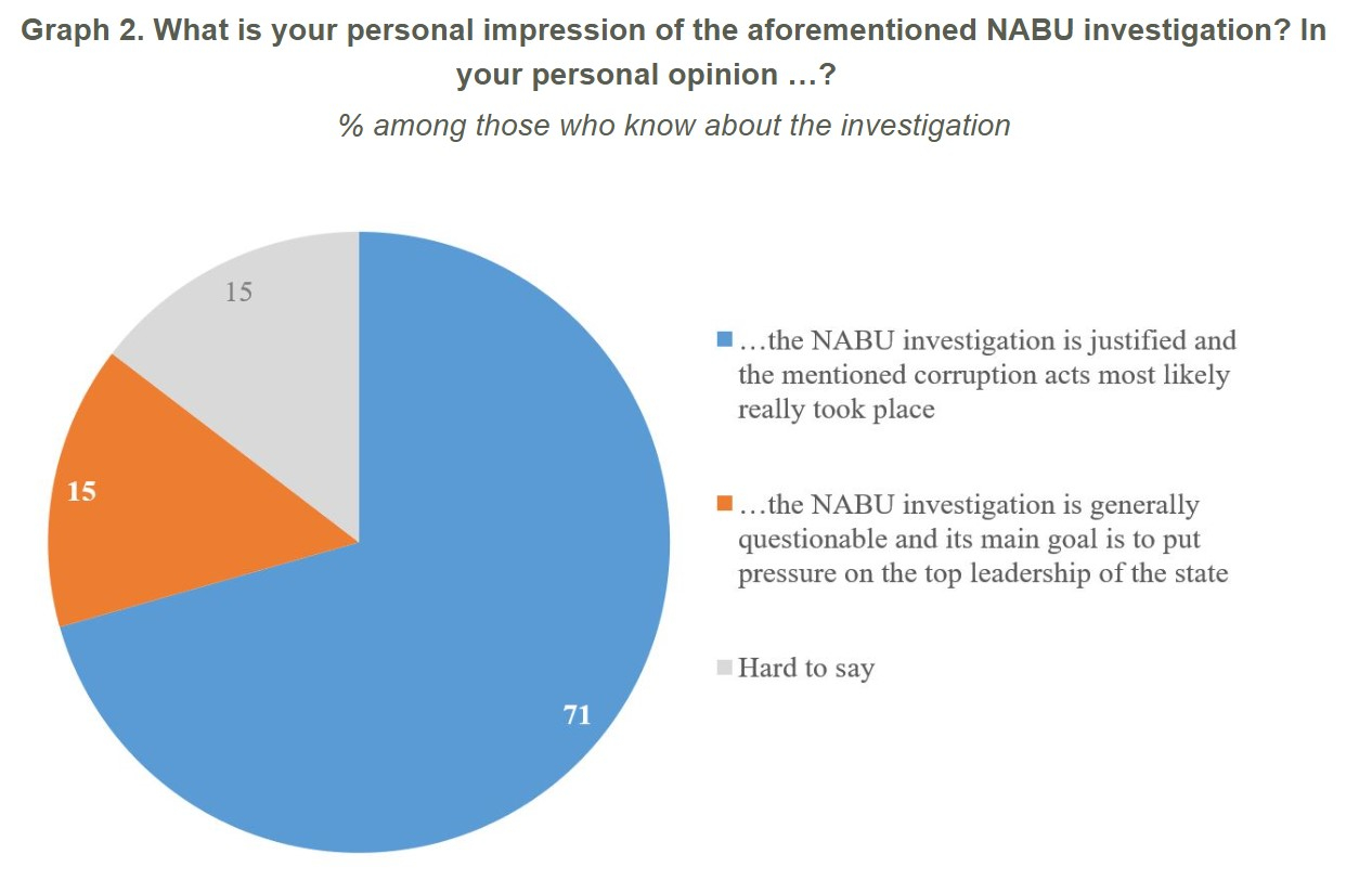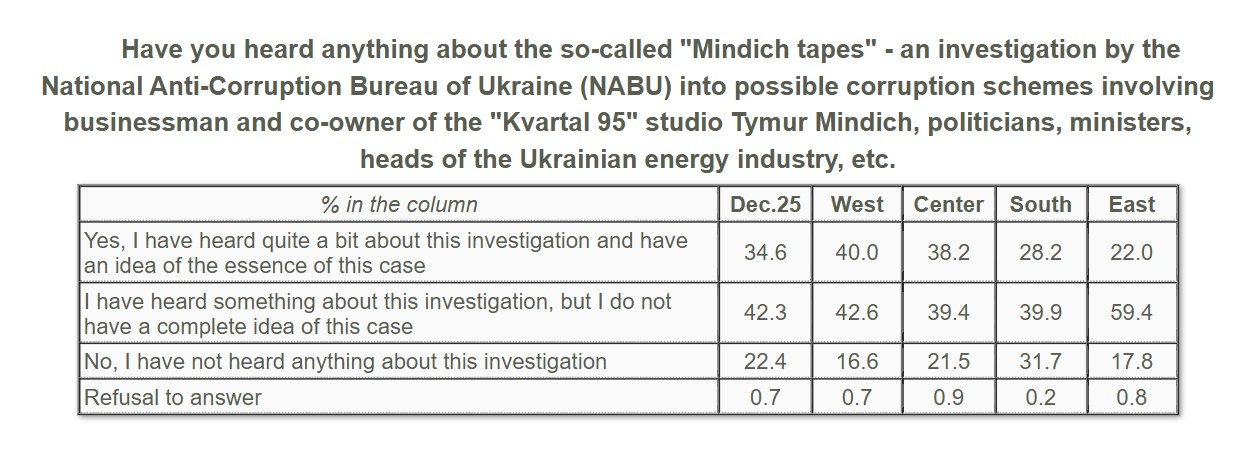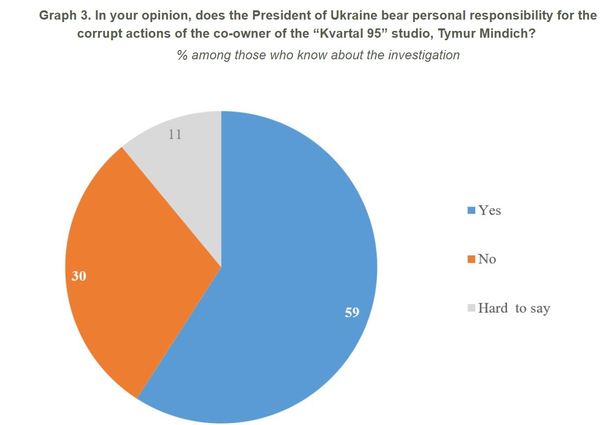 In addition, 59% of those aware of the investigation believe that Zelenskyy is personally responsible for Mindich's actions. This view is not shared by 30% of respondents, while 11% were undecided.