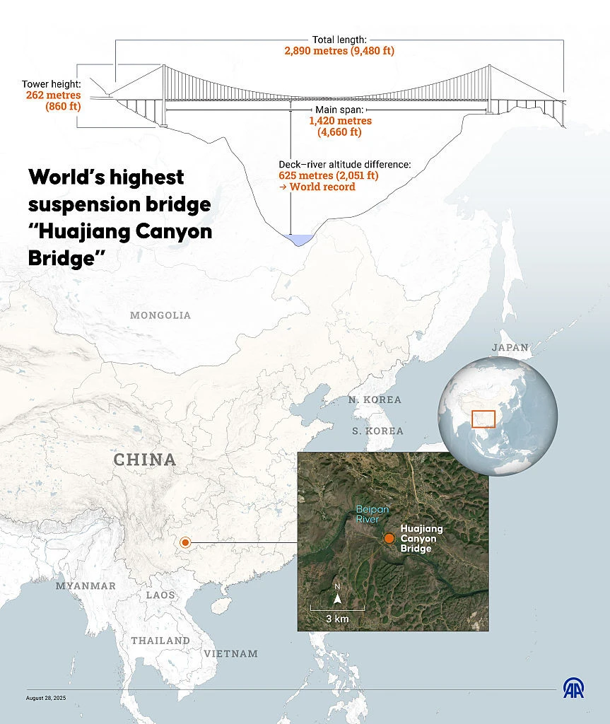 фото: GettyImagesМіст перетинає річку Бейпан, яка протікає через глибоку ущелину Хуацзян. І хоч його висота не для людей зі слабкими нервами, але таким чином час у дорозі скорочується до лічених хвилин, тоді як раніше місцеві мешканці були змушені витрачати майже до двох годин на перетин величезного каньйону.Загальна довжина мосту становить майже 2,9 кілометра, а найдовша безперервна частина конструкції – простягається на майже 1,5 кілометра. Його підтримують дві основні вежі висотою 262 метри.