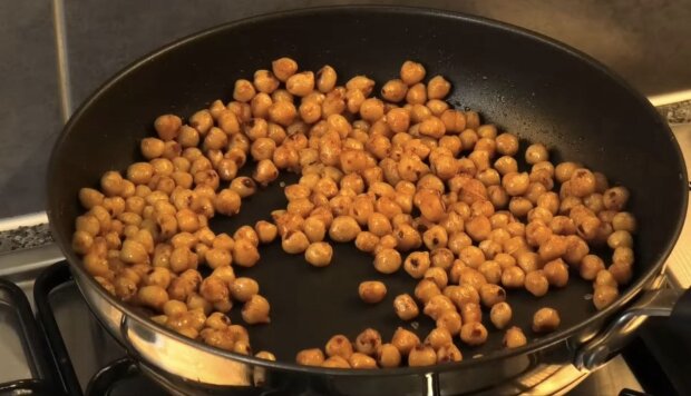 Тим часом підготуйте ну. Розігрійте оливкову олію на сковороді та обсмажте нут протягом 2-3 хвилин. Додайте хариссу та ретельно перемішайте. Додайте лимонний сік та дрібку солі та готуйте, поки рідина не випарується.