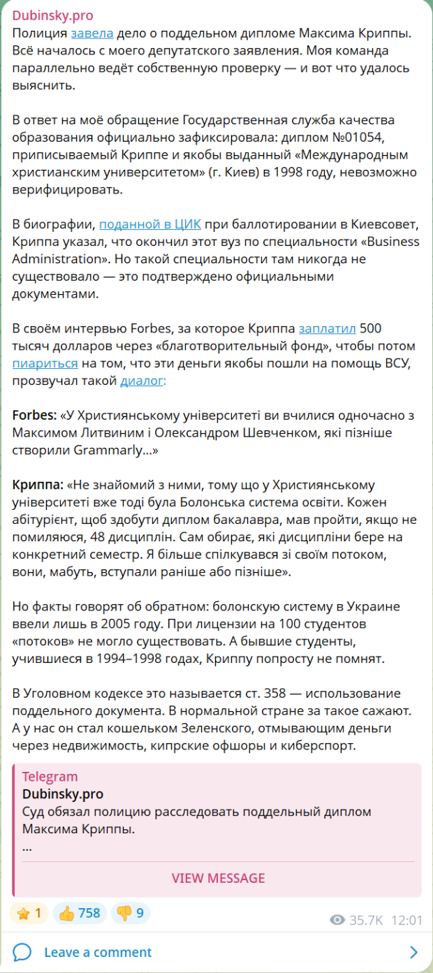 "Поліція завела справу про підроблений диплом Максима Криппи. Все почалося з моєї депутатської заяви. Моя команда паралельно веде власну перевірку," – повідомив Олександр Дубінський.
