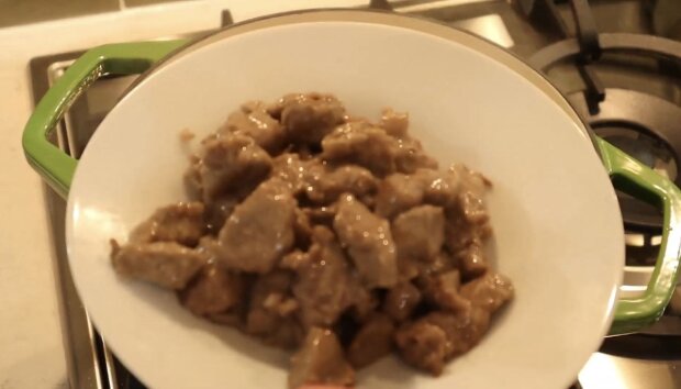 Потім влийте бульйон і додайте попередньо обсмажене м’ясо. Варіте 30 хвилин, поки м’ясо не стане м’яким.