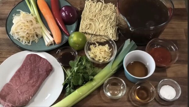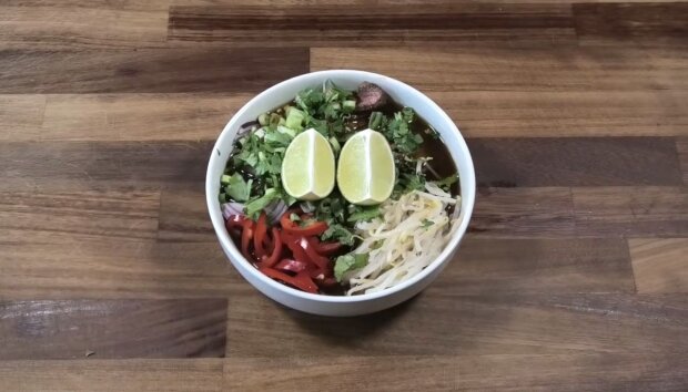 Збираємо страву. Розкладаємо локшину по тарілках і заливаємо бульйоном. Додаємо м’ясо та свіжі овочі, прикрашаємо кінзою та лаймом. Кличемо родину до столу та насолоджуємося насиченим та незвичним смаком.