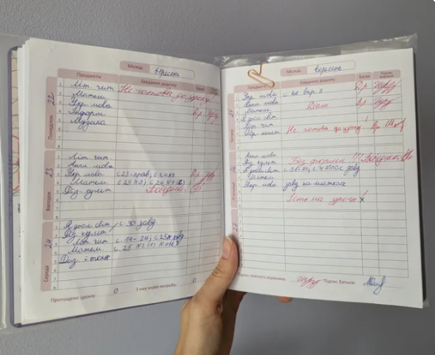 Українська мама з ніком olgyssss показала в соцмережі Threads щоденник своєї доньки, і цей пост миттєво став вірусним. Жінка зізналася, що не заглядала в нього два тижні, а коли нарешті відкрила — ледь не впала зі стільця. Сторінки були списані червоною пастою: зауваження про те, що дитина не готова до уроку, не має форми або їсть на занятті, з’являлися майже щодня.