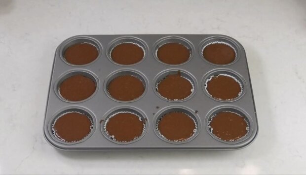 Вистеліть форму для мафінів паперовими формочками для кексів. Повністю заповніть формочки тістом.