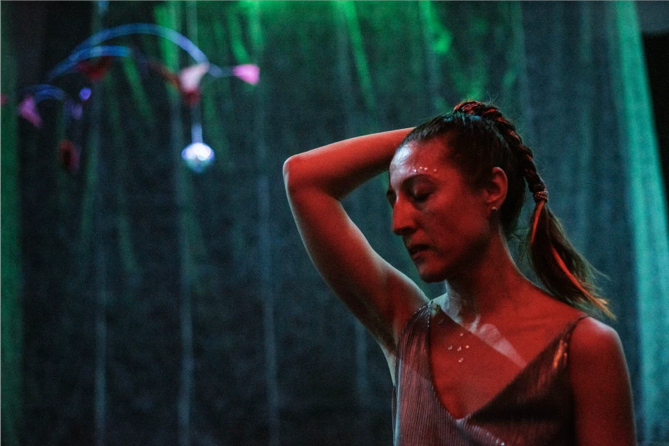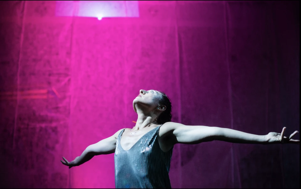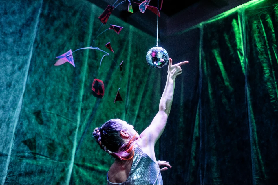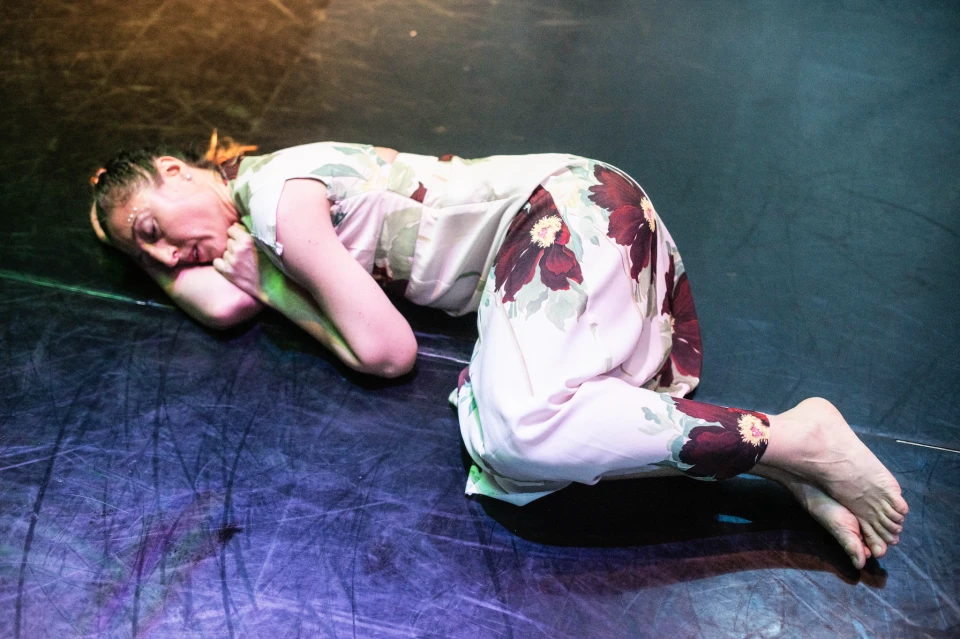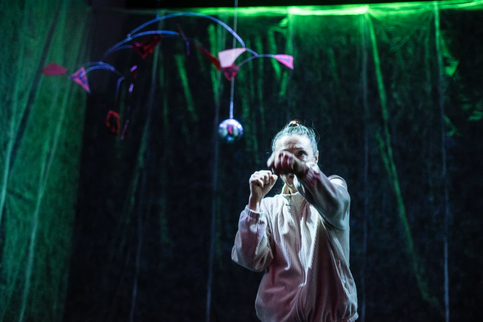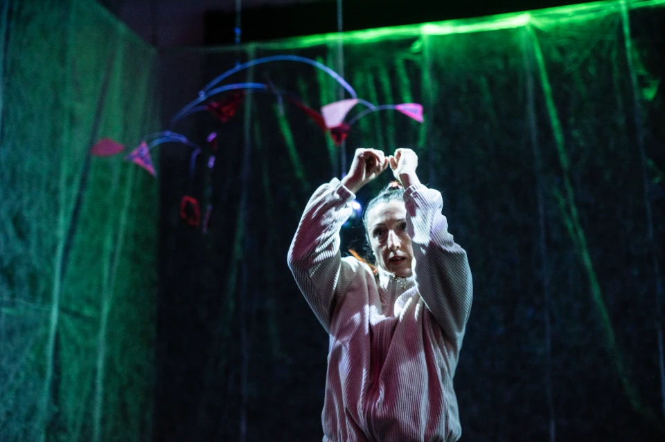 Фото: Катерина СкрагленкоУ третій частині зʼявляється голос, тіло звучить. Танцівниця відкрито дивиться вгору або ж падає долілиць, її невелика витончена фігура заповнює весь простір. Вона тягнеться до кінетичної скульптури (авторства Василя Дмитрика), яка для неї самої є символом вибуху.