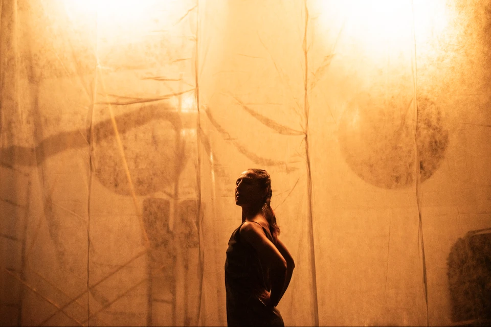 Білі, напівпрозорі полотна, розвішані по периметру зали, окреслюють межі простору, всередині якого опиняються всі: і глядачі, і перформерка. Ці декорації стирають межу між усіма присутніми. Перед початком перформансу "Історія одного тіла" авторка Вікторія Хорошилова запрошує долучитися до рухливої гри. Глядачам роздають завдання: переміщатися в просторі, спостерігати за іншими людьми, за власними відчуттями. Ці задачі перетворюють спостерігачів на учасників перформансу, обʼєднують їх між собою та з самою перформеркою.Тому далі дивитися сольний перформанс "Історія одного тіла" глядач починає вже з точки довіри до простору і до режисерки-виконавиці. Сидячи всередині залу, обмеженого декораціями, глядачу складніше бути в позиції відстороненості. Хорошилова експериментує не лише зі своєю тілесністю, а й з тим, як швидко інші люди - глядачі - готові налагоджувати звʼязок зі своїм тілом. Така зміна ролей, коли глядач зі спостерігача стає учасником процесу, а потім знову глядачем, змінює моє сприйняття перформансу з самого початку.Танцівниця перебуває наодинці з собою в оточенні глядачів, вона усамітнюється посеред простору, по периметру якого щільно розмістилися люди, не зводячи з неї очей. Спостерігаючи за цією безперечно особистою історією, я не відчуваю сорому за свою жадібність, з якою вдивляюсь у рухи перформерки, які оголяють її зсередини. Це досвіди, якими вона ділиться, свідками яких вона дозволяє нам ставати.