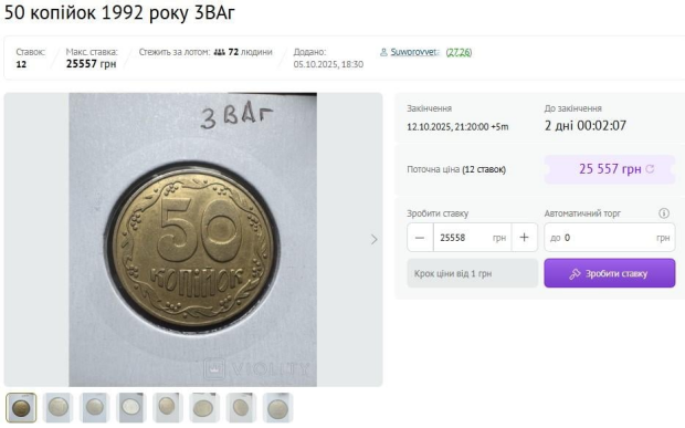 Великий інтерес, зокрема, викликають 50 копійок 1992 року випуску різновиду 3ВАг. На аукціоні Violity за них пропонують понад 25 500 гривень.