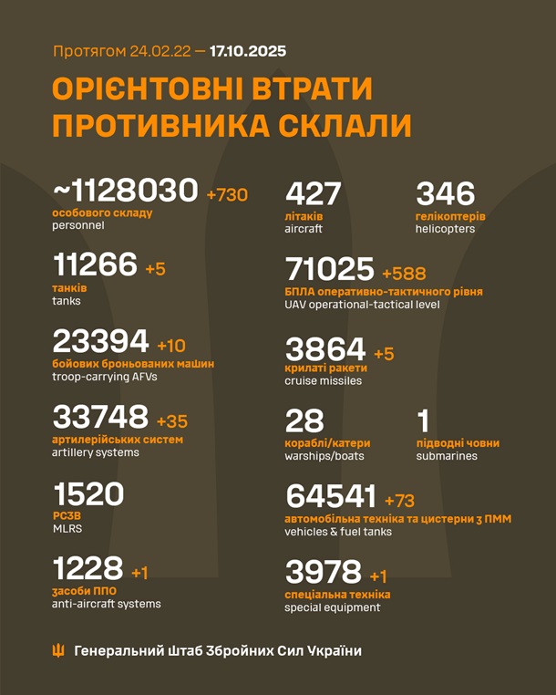 З 24 лютого 2022 року по 17 жовтня 2025 року загальні бойові втрати особового складу російських військ на території України орієнтовно склали 1 128 030 осіб (+730 за добу). Про це повідомив Генеральний штаб ЗСУ.