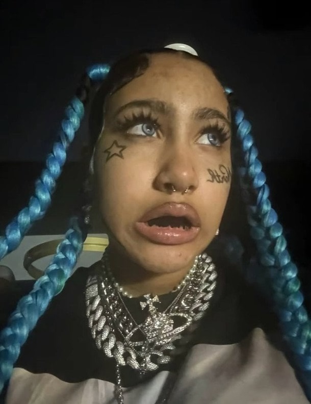 Проте найбільше уваги привернули чорні грілзи на зубах, пірсинг у носі та татуювання на обличчі. Як згодом з’ясувалося, прикраси та тату -не справжні, а лише частина образу.