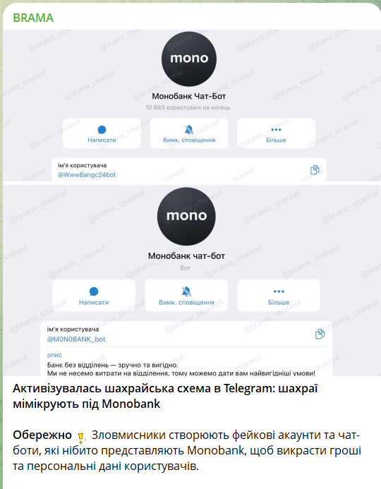 У Telegram зросла активність шахраїв, які створюють фейкові акаунти та чат-боти Monobank для крадіжки грошей і особистих даних користувачів. Клієнтів банку закликали бути пильними, повідомляє BRAMA.