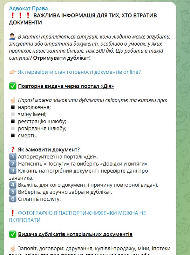 Про те, як отримати дублікати документів, розповіли у телеграм каналі "Адвокат Права".