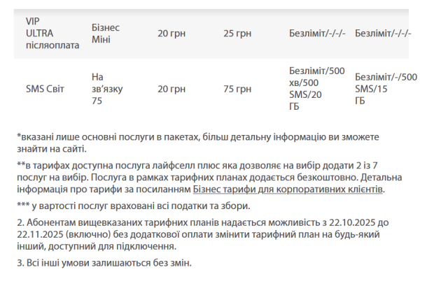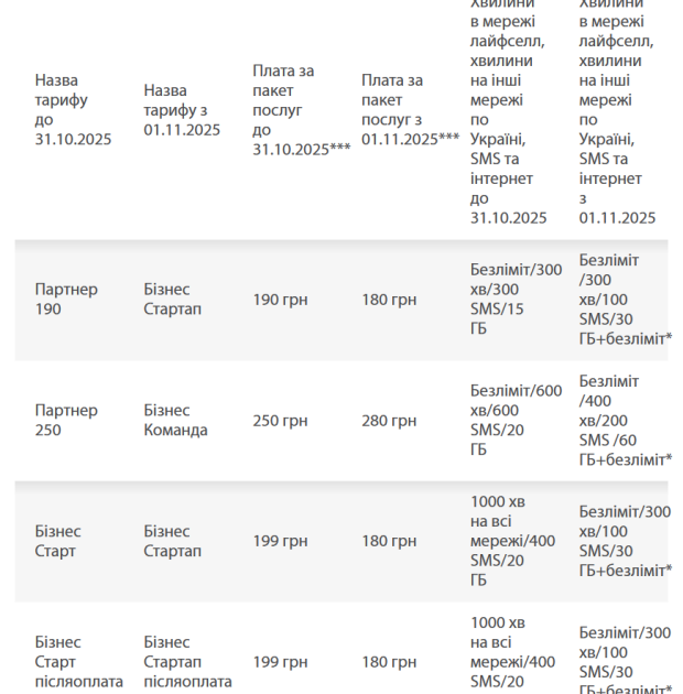 Ці тарифні плани будуть замінені новими моделями обслуговування з іншими назвами та цінами. Абоненти автоматично перейдуть на оновлені умови. Наприклад, пакет "Партнер 190" отримає назву "Бізнес Стартап" із новою ціною в 180 грн замість попередніх 190 грн.