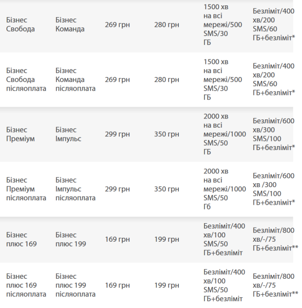 Пакет "Бізнес плюс 169" отримує оновлену назву "Бізнес плюс 199", ціна його зросте, відповідно, з 169 грн до 199 грн.