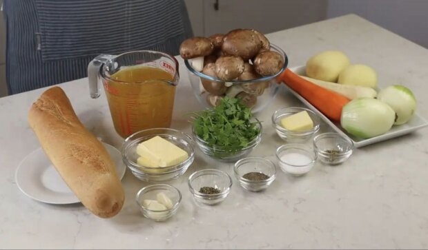 Дрібно наріжте дві великі цибулини, одну велику моркву та один великий корінь петрушки наріжте тонкими півскибочками товщиною приблизно 2 мм, 300 г картоплі наріжте кубиками товщиною приблизно 0,5 см, а півкілограма грибів наріжте скибочками товщиною приблизно 3 мм. Відкладіть кілька скибочок для смаження та прикраси супу пізніше. Нарешті, дрібно наріжте невеликий пучок петрушки. Відкладіть повну чайну ложку петрушки в окрему миску.