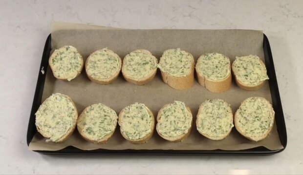 Наріжте багет на скибочки приблизно 0,5 сантиметра та викладіть їх на деко, застелене пергаментним папером. Змастіть кожен скибочку такою ж кількістю приправленого вершкового масла, рівномірно розподіляючи його по всій поверхні. Випікайте підсмажений хліб у розігрітій духовці при температурі 180 °C приблизно 8 хвилин або до золотисто-коричневого кольору.