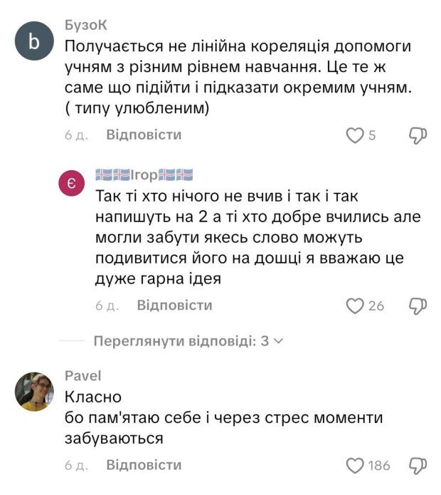 "Получається не лінійна кореляція допомоги учням з різним рівнем навчання. Це те ж саме що підійти і підказати окремим учням. (типу улюбленим)".