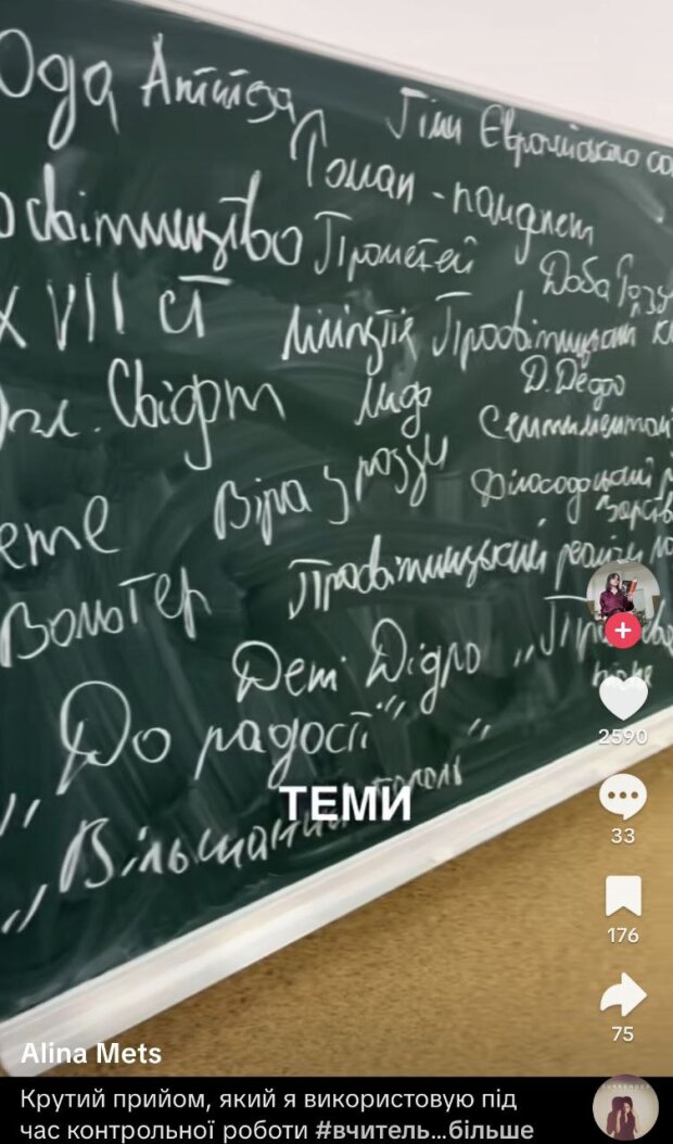 Українська вчителька зарубіжної літератури розповіла про прийом, який вона використовує під час контрольної роботи. У відео у соцмережі ТікТок вона поділилася, що перед контрольною вона згадує всю ту термінологію, яку вивчали протягом теми, та пише її на дошці.