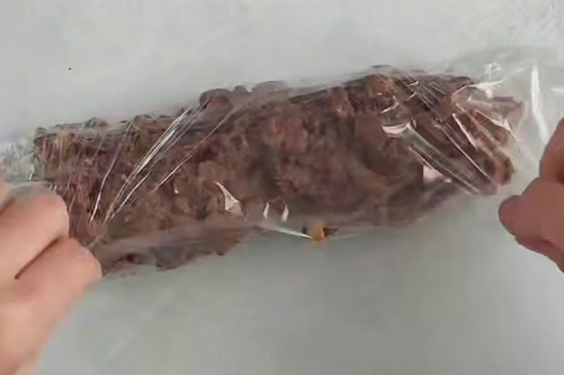 «Тісто», що вийшло, розділіть на три частини і сформуйте ковбаски, використовуючи харчову плівку. Щільно загорніть, намагаючись витіснити повітря.