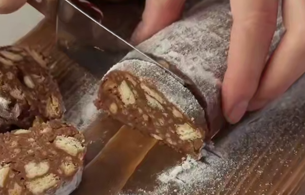 Цей десерт – машина часу. Та сама шоколадна ковбаска, яку не потрібно пекти: густа, хрумка, з горіхами та глибоко шоколадним смаком.