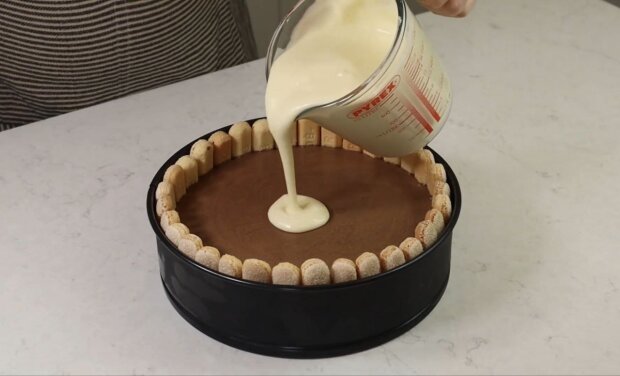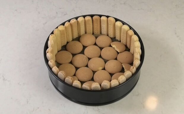 Вистеліть дно рознімної форми діаметром 23 см пергаментним папером і викладіть зверху кругле печиво. Викладіть боки форми довгим печивом, обрізаним такої ж висоти, як і форма.