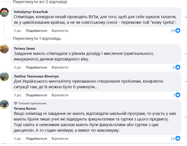 "Якщо олімпіад ні завдання не мають відповідати шкільній програмі, то участь у них мають брати лише учні які відвідують факультативи та гуртки з цього предмету . Тоді навіть в невеликих школах мають бути факультативи або гуртки з цих дисциплін. А то годин мінімум, а вимог по максимуму".