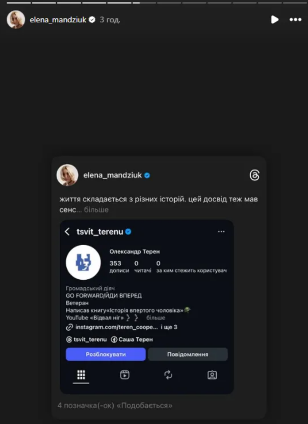 Відома українська блогерка та інфлюенсерка Олена Мандзюк зробила несподіваний крок у стосунках із колишнім героєм шоу "Холостяк-13" та ветераном ЗСУ Олександром Тереном — вона заблокувала його в Instagram.