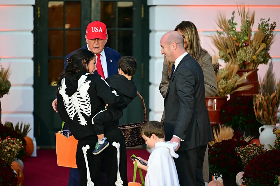 фото: Getty Images Святкування на тлі шатдаунуТрадиційне святкування в Білому домі відбулося, попри те що Трамп повернувся лише за кілька годин до цього після шестиденного турне країнами Азії і на тлі урядового шатдауну, який триває вже тридцятий день.Трамп закликав відновити роботу уряду, однак демократи в Конгресі вимагають продовжити дію податкових пільг, які допомагають мільйонам людей оплачувати медичне страхування. Їхні колеги-республіканці заявляють, що не вестимуть переговорів, доки уряд не буде знову відкрито.Як відмітили у виданні, запроваджені Трампом мита на імпорт із Китаю призвели до скорочення запасів і підвищення цін на геловінські костюми для американських імпортерів, роздрібних продавців і покупців. Попри це, фасад Білого дому прикрасили десятки декорацій у вигляді великих осінніх листків і квітів, зокрема помаранчевих і червоних хризантем. Сходи, що ведуть до балкона, були заставлені вирізаними гарбузами.Хто відвідав захід? Серед дітей, які відвідали святкування, були діти військовослужбовців і співробітників Білого дому. Прессекретарка Білого дому Каролайн Левіт прийшла зі своїм маленьким сином, одягненим у костюм гарбуза. Колишня співробітниця адміністрації Трампа Кеті Міллер була вбрана у скелета, тоді як її чоловік, заступник керівника апарату Білого дому Стівен Міллер, обмежився діловим костюмом.Сотні дітей – від малюків до підлітків – прийшли в костюмах Людини-павука, Капітана Америки, балерин, принцес і лепреконів. Двоє хлопчиків були в костюмах і кепках із прізвищем Трампа та з усмішками, схожими на президентську, хоча наслідувати його фірмову зачіску вони не намагалися. Дівчинка, що була з ними, одягла білий плащ поверх сукні – подібної до тих, які зазвичай обирає перша леді. Дехто з батьків вдягли кепки з написом "USA", як у Трампа. фото: Getty Images