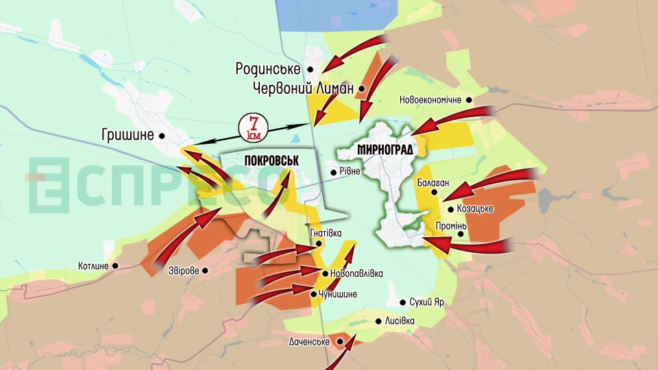 Карта бойових дій за 25-31 жовтня, фото: ЕспресоЯкщо провести лінію між передовими загонами окупантів на дорозі до Гришиного та іншими у Червоному Лимані, то побачимо, що для повного оточення Покровська рашистам залишається захопити менш ніж 7 км здебільшого польової території. Однак насправді чи можна вважати захопленою територією ту, де розташована хоч і велика кількість, але все ж диверсійних груп, які просто не здатні утворити суцільну зону контролю. ЗСУ як і росіяни стягують до Покровська і Мирнограда свої найсильніші підрозділи, розуміючи, що цей бій матиме наслідки і вплив на подальший хід війни. Втрата Покровська і Мирнограда дозволить ворогу впритул підійти до бою за Слов’янськ і Краматорськ, а також вийти на простори Дніпровщини, де є мало населених пунктів. Спроможних їх зупиняти.Наступ на Дніпровщині до ПокровськогоНа Олександрівському фронті ворог подолав головну лінію нашої оборони та просувається до Покровського. Почалися головні бої за села Вишневе і Єгорівка – останніми перепонами, які стоять на шляху до виходу ворога на трасу Покровське – Гуляйполе, а це радикально погіршить умови нашої оборони як на Запоріжжі, так і на Дніпровщині.