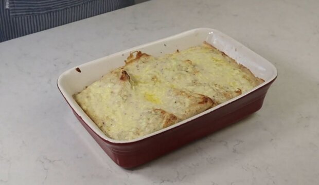 Шар бешамелю зберігає млинці м’якими після випікання, а вся начинка наповнена приємним ароматом мускатного горіха.