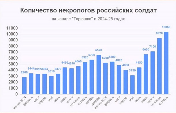 Підкреслюється, що це далеко не всі дані про загибель російських солдатів, які воюють проти України, але зростання кількості некрологів промовисте.