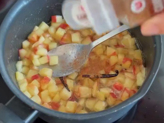 Почнемо з яблучної карамелі. Наріжте яблука акуратними кубиками і викладіть їх у сотейник зі шматочком вершкового масла. На повільному вогні додайте цукор та ваніль, помішуючи, доведіть до тягучої, ароматної маси.
