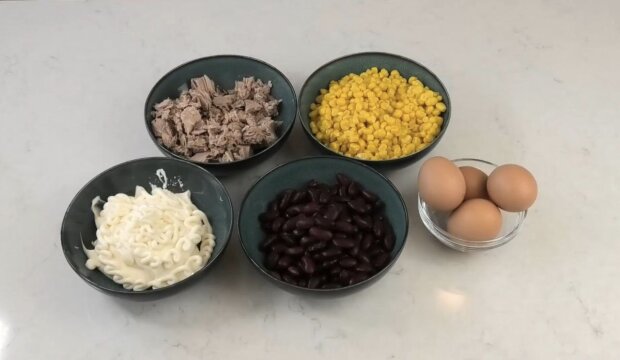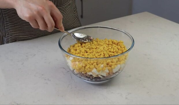 Різнокольорові шари квасолі, тунця, яєць, кукурудзи та майонезу роблять салат візуально привабливим та поживним.