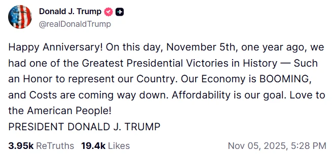 Відповідний допис він опублікував у своїй соцмережі Truth Social.Президент США зазначив, що рівно рік тому він разом зі своєю командою здобув "одну з найбільших перемог у президентських виборах в історії". "Для нас велика честь представляти нашу країну. Наша економіка процвітає, а витрати значно знижуються. Наша мета – доступність", - додав американський лідер.