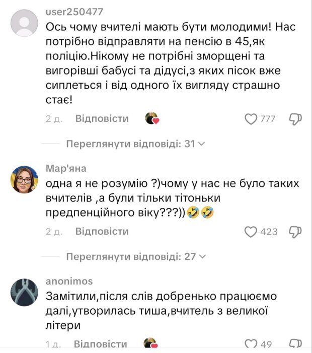 "Ось чому вчителі мають бути молодими! Нас потрібно відправляти на пенсію в 45,як поліцію.Нікому не потрібні зморщені та вигорівші бабусі та дідусі,з яких пісок вже сиплеться і від одного їх вигляду страшно стає!"