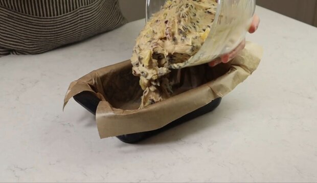 Перекладіть тісто у змащену маслом та вистелену пергаментним папером форму для випікання хліба (розміром 10 х 21 см).