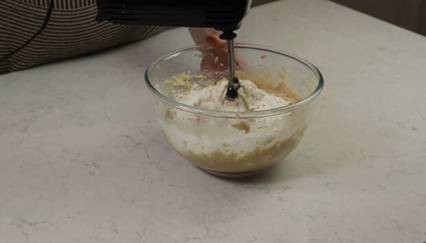 Просійте розпушувач у борошно. Додавайте борошно в тісто по кілька столових ложок за раз, змішуючи на низькій швидкості.