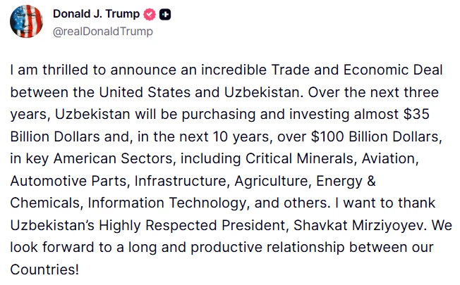 Про це Дональд Трамп написав у своїй соцмережі Truth Social."Я радий оголосити про укладення надзвичайної торговельно-економічної угоди між Сполученими Штатами та Узбекистаном. Протягом наступних трьох років Узбекистан здійснить закупівлі та інвестиції на суму майже 35 мільярдів доларів, а протягом наступних десяти років – понад 100 мільярдів доларів у ключові американські сектори, зокрема рідкісноземельні матеріали, авіацію, виробництво автозапчастин, інфраструктуру, сільське господарство, енергетику й хімічну промисловість, інформаційні технології та інші галузі", - зазначив американський лідер.Він висловив вдячність президенту Узбекистану Шавкату Мірзійоєву, додавши, що США з нетерпінням очікують на тривалі та плідні відносини між країнами.