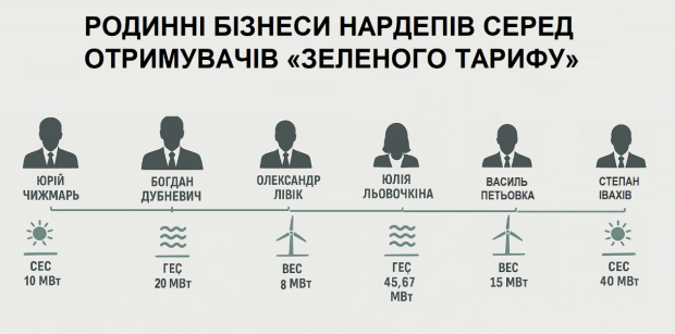 За даними проекту «Чесно», серед власників компаній, які отримують виплати за «зеленим тарифом», — родичі екс-депутатів Юрія Чижмаря, Богдана Дубневича, Василя Петьовки, Олександра Лівіка та Юлії Льовочкіної. Їхні підприємства сумарно генерують десятки мільйонів євро щорічно.