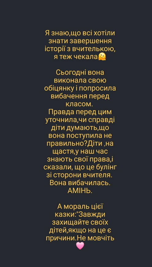 Авторка допису поговорила із вчителькою, яка визнала, що вчинила неправильно. За її словами, вона хотіла зробити красиве фото для соцмереж. Вчителька обіцяла вибачитися перед дитиною, і дотрималася своєї обіцянки.