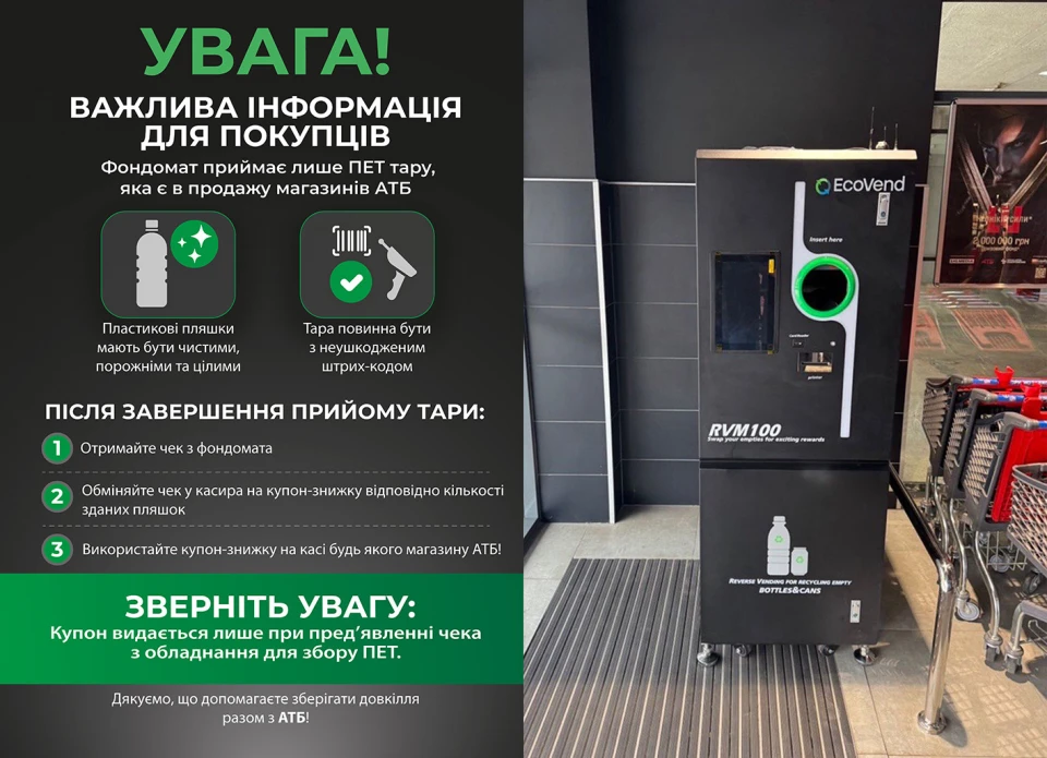 Львівщина, яка за час війни стала справжнім хабом для внутрішніх переселенців, виступила тестовим майданчиком для нової екологічної ініціативи АТБ.Багаторічний лідер вітчизняного ритейлу встановив у двох магазинах міста Лева інноваційні апарати з приймання ПЕТ-тари. Йдеться про використані пластикові пляшки, які потребують правильної утилізації, адже матеріал, з якого їх виготовляють, у разі потрапляння на звичайні полігони відходів розкладається дуже повільно, роками виділяючи токсичні речовини та завдаючи значної шкоди довкіллю.Сучасні фандомати для приймання пластикової тари розміщено біля входу у львівські магазини АТБ «Продукти 691» (Сихівський район, вул. Зелена, 149) та «Продукти 1087» (Шевченківський район, вул. Авраама Лінкольна, 49). Ці апарати мають спеціальний отвір, куди потрібно вкладати будь-які пластикові пляшки, які обов’язково мають бути порожніми, чистими та цілими. У відповідь апарат видає чек, який потрібно зберегти й обміняти на купон-знижку (-20%) на каву в АТБ. Отриманий купон можна використати одразу на касі цього ж магазину або в будь-якому іншому магазині АТБ. Дійсний такий купон впродовж одного місяця.