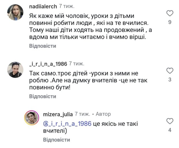 Думка блогерки викликала різну реакцію у її підписників. Чимало людей повністю підтримали Юлію, але були й ті, хто переконаний, що не можна зовсім не втручатися у навчальний процес. Одні батьки допомагають та пояснюють складний матеріал, інші вимушені контролювати все від початку до кінця, бо різні діти мають свої особливості у засвоєнні шкільної програми.