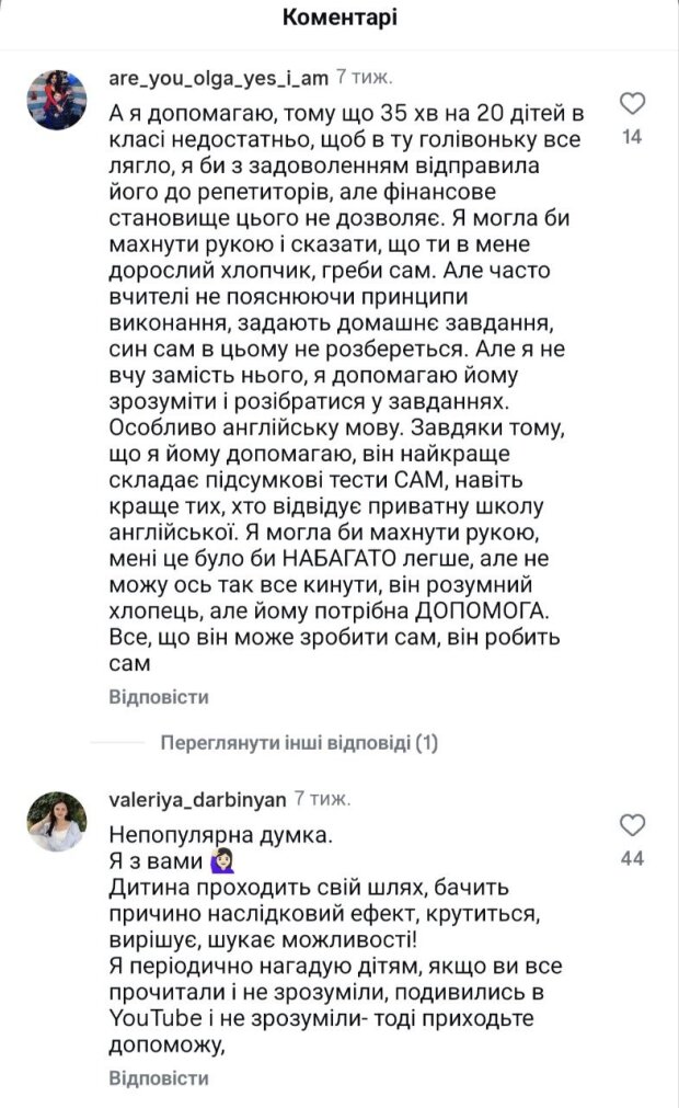"А я допомагаю, тому що 35 хв на 20 дітей в класі недостатньо, щоб в ту голівоньку все лягло, я би з задоволенням відправила його до репетиторів, але фінансове становище цього не дозволяє. Я могла би махнути рукою і сказати, що ти в мене дорослий хлопчик, греби сам. Але часто вчителі не пояснюючи принципи виконання, задають домашнє завдання, син сам в цьому не розбереться. Але я не вчу замість нього, я допомагаю йому зрозуміти і розібратися у завданнях".