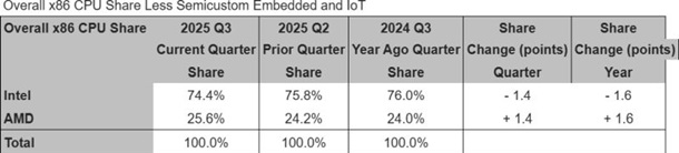 У третьому кварталі частка компанії у сегменті x86-процесорів (без урахування вбудованих систем та IoT) зросла до 25,6%. Роком раніше вона становила 24%, а лише за один квартал AMD додала ще 1,4 відсотка після результату 24,2% у другому кварталі.
