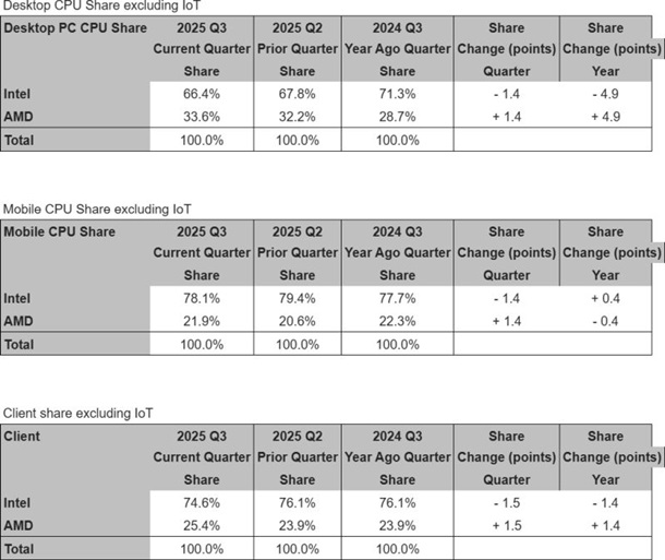 У мобільному сегменті ситуація більш стримана: Intel змогла дещо збільшити річну частку з 77,7% до 78,1%, хоча квартально втратила 1,4 відсотків. AMD, відповідно, у річному вимірі знизилася з 22,3% до 21,9%, але зросла відносно другого кварталу.