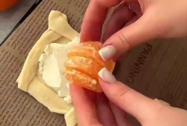 На кожен шматочок тіста викладіть сир, зверху — часточки мандарину. Змастіть краї жовтком і посипте тростинним цукром, щоб при випіканні з'явилася карамельна скоринка.