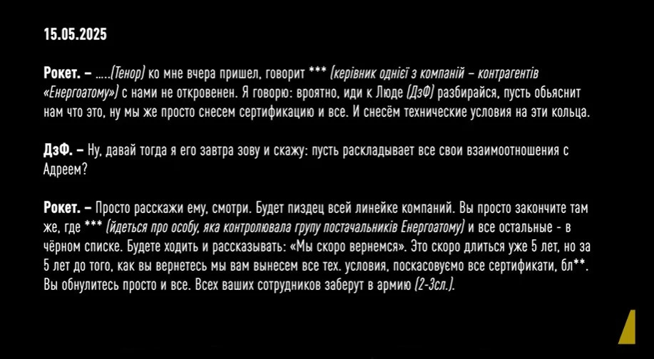 фото: energoatom.uaЗагалом детективам вдалось отримати близько 1000 годин аудіозаписів. Припускають, що саме те, що детективи НАБУ збирали матеріали на співзасновника "Студії Квартал 95" та колишнього бізнес-партнера Зеленського Тимура Міндіча та його спільників, стало головною причиною ухвалення закону, який обмежував свободу Національного антикорупційного бюро, і в результаті став причиною так званого "Картонкового Майдану". За даними НАБУ, "високорівнева злочинна організація" систематично отримувала від контрагентів Енергоатому у розмірі від 10% до 15% від вартості контрактів. "Зокрема контрагентам Енергоатому нав’язувались умови сплати відкату за уникнення блокування платежів за надані послуги/поставлену продукцію або позбавлення статусу постачальника. Ця практика отримала назву "шлагбаум", – повідомляє НАБУ.Читайте також: Найдорожчі тендери Енергоатому: що і у кого замовляла НАЕК на сотні мільйонів гривень під час повномасштабного вторгненняНасправді практика, коли тендери виграють "правильні" фірми, які погоджуються платити відкати, не нова. Так само як і вимагання відкатів від тих, хто виграв прозорий конкурс, через блокування платежів за уже виконані роботи. Однак у випадку з Енергоатомом вражають суми відкатів, адже тут вартість однієї закупівлі вимірюється сотнями мільйонів гривень, а подекуди і мільярдами. Наприклад, будівництво інженерного захисту для ПАЕС у 2024 році замовили за 2,26 млрд грн. При цьому тендер виграла компанія, яка з 2007 року перебуває у процесі банкрутства.