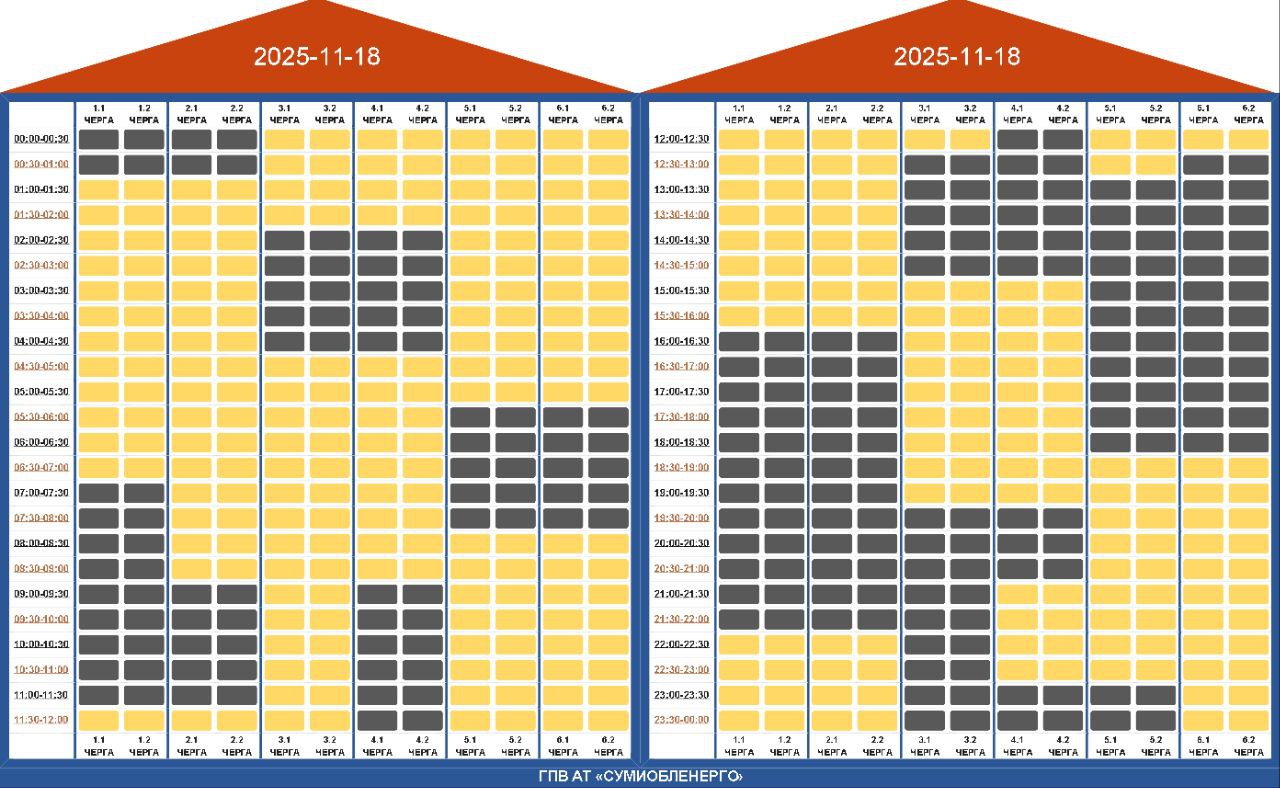 - 4.1 та 4.2 черги: 00:00–04:00, 11:30–15:30, 18:30–24:00