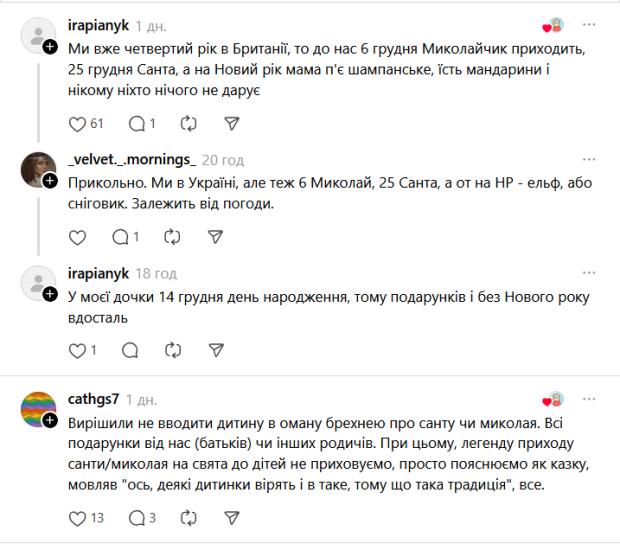 "Вирішили не вводити дитину в оману брехнею про санту чи миколая. Всі подарунки від нас (батьків) чи інших родичів. При цьому, легенду приходу санти/миколая на свята до дітей не приховуємо, просто пояснюємо як казку, мовляв "ось, деякі дитинки вірять і в таке, тому що така традиція", все".